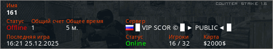 Играет на Counter Strike 1.6 сервере. Страна: РоссияПервый раз замечен 16:15 25.12.2025