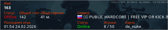 Играет на Counter Strike Global Offensive сервере. Страна: РоссияПервый раз замечен 17:47 03.07.2025