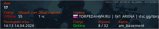 Играет на Counter Strike Global Offensive сервере. Страна: РоссияПервый раз замечен 14:54 07.04.2026
