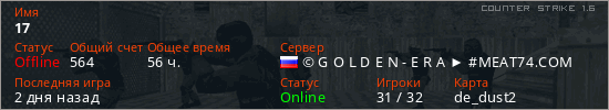 Играет на Counter Strike 1.6 сервере. Страна: РоссияПервый раз замечен 10:41 16.01.2023