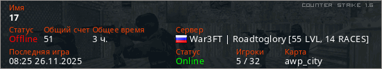Играет на Counter Strike 1.6 сервере. Страна: РоссияПервый раз замечен 10:50 22.10.2022