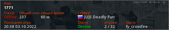 Играет на Counter Strike 1.6 сервере. Страна: РоссияПервый раз замечен 23:04 22.09.2022