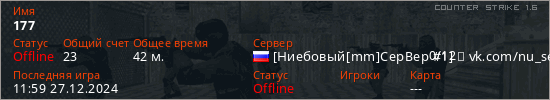 Играет на Counter Strike 1.6 сервере. Страна: РоссияПервый раз замечен 16:19 13.10.2022