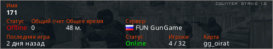 Играет на Counter Strike 1.6 сервере. Страна: РоссияПервый раз замечен 10:48 14.03.2026