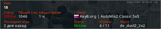 Играет на Counter Strike 1.6 сервере. Страна: РоссияПервый раз замечен 16:55 10.09.2024