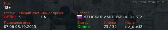 Играет на Counter Strike 1.6 сервере. Страна: РоссияПервый раз замечен 07:38 29.03.2022