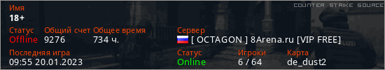 Играет на Counter Strike Source сервере. Страна: РоссияПервый раз замечен 10:30 13.01.2020