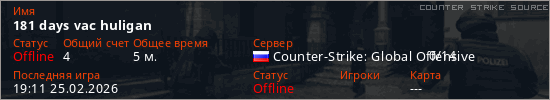 Играет на Counter Strike Source сервере. Страна: РоссияПервый раз замечен 19:05 25.02.2026