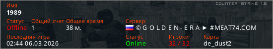 Играет на Counter Strike 1.6 сервере. Страна: РоссияПервый раз замечен 18:06 13.02.2026