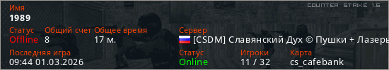 Играет на Counter Strike 1.6 сервере. Страна: РоссияПервый раз замечен 19:37 26.02.2026