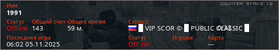 Играет на Counter Strike 1.6 сервере. Страна: РоссияПервый раз замечен 01:48 21.10.2025
