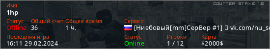 Последний раз был в сети 16:11 29.02.2024 Игрок с таким ником замечен на 36 серверах