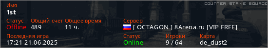 Играет на Counter Strike Source сервере. Страна: РоссияПервый раз замечен 00:42 02.10.2020