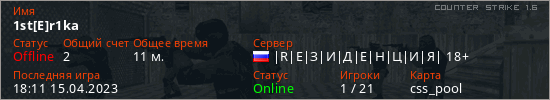 Играет на Counter Strike 1.6 сервере. Страна: РоссияПервый раз замечен 20:51 01.03.2023
