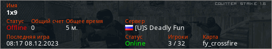 Играет на Counter Strike 1.6 сервере. Страна: РоссияПервый раз замечен 08:11 08.12.2023