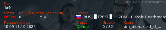 Играет на Half Life 2 DeathMatch сервере. Страна: РоссияПервый раз замечен 10:03 11.10.2025