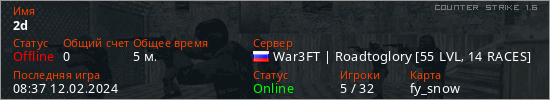 Играет на Counter Strike 1.6 сервере. Страна: РоссияПервый раз замечен 08:28 12.02.2024