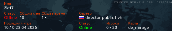 Играет на Counter Strike Global Offensive сервере. Страна: РоссияПервый раз замечен 20:27 06.04.2026