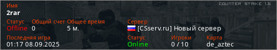 Играет на Counter Strike 1.6 сервере. Страна: РоссияПервый раз замечен 01:15 08.09.2025