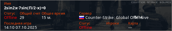 Играет на Counter Strike Source сервере. Страна: РоссияПервый раз замечен 12:04 07.10.2025