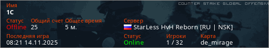 Играет на Counter Strike Global Offensive сервере. Страна: РоссияПервый раз замечен 08:19 14.11.2025