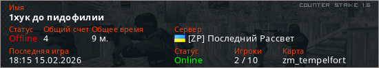 Играет на Counter Strike 1.6 сервере. Страна: УкраинаПервый раз замечен 17:41 15.02.2026