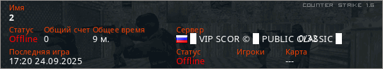 Играет на Counter Strike 1.6 сервере. Страна: РоссияПервый раз замечен 12:56 23.09.2025