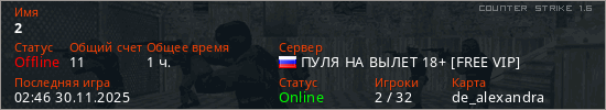 Играет на Counter Strike 1.6 сервере. Страна: РоссияПервый раз замечен 10:19 21.08.2025