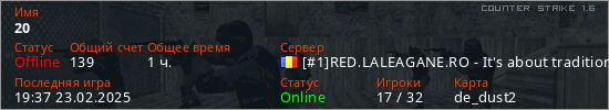 Играет на Counter Strike 1.6 сервере. Страна: РумынияПервый раз замечен 19:40 02.02.2025