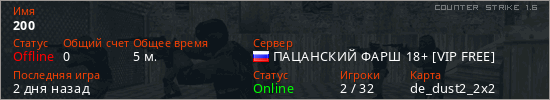 Играет на Counter Strike 1.6 сервере. Страна: РоссияПервый раз замечен 17:40 19.03.2026