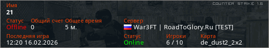 Играет на Counter Strike 1.6 сервере. Страна: РоссияПервый раз замечен 12:18 16.02.2026