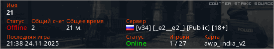 Играет на Counter Strike Source сервере. Страна: РоссияПервый раз замечен 13:20 01.12.2023