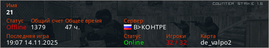 Играет на Counter Strike 1.6 сервере. Страна: РоссияПервый раз замечен 06:12 13.02.2020