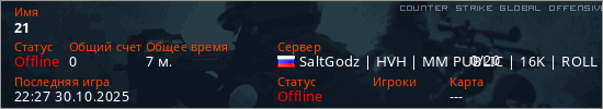 Играет на Counter Strike Global Offensive сервере. Страна: РоссияПервый раз замечен 19:45 23.10.2025