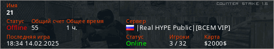 Последний раз был в сети 18:34 14.02.2025 Игрок с таким ником замечен на 55 серверах