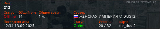 Играет на Counter Strike 1.6 сервере. Страна: РоссияПервый раз замечен 16:50 08.09.2022