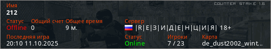 Играет на Counter Strike 1.6 сервере. Страна: РоссияПервый раз замечен 11:59 18.12.2024