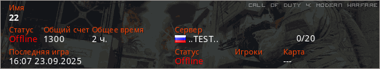 Играет на Call of Duty 4: Modern Warfare сервере. Страна: РоссияПервый раз замечен 11:15 19.02.2025