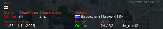 Последний раз был в сети 11:25 11.11.2025 Игрок с таким ником замечен на 57 серверах