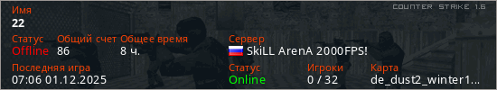 Играет на Counter Strike 1.6 сервере. Страна: РоссияПервый раз замечен 09:36 21.09.2022
