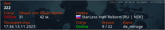 Играет на Counter Strike Global Offensive сервере. Страна: РоссияПервый раз замечен 00:35 24.10.2025