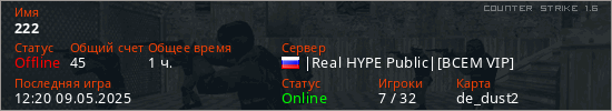 Играет на Counter Strike 1.6 сервере. Страна: РоссияПервый раз замечен 12:41 25.04.2024