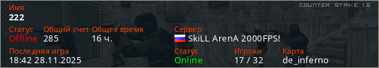 Играет на Counter Strike 1.6 сервере. Страна: РоссияПервый раз замечен 19:06 01.08.2022