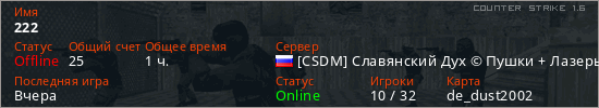 Играет на Counter Strike 1.6 сервере. Страна: РоссияПервый раз замечен 20:52 12.05.2024