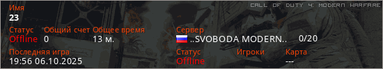 Играет на Call of Duty 4: Modern Warfare сервере. Страна: РоссияПервый раз замечен 17:43 06.10.2025
