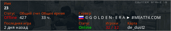 Играет на Counter Strike 1.6 сервере. Страна: РоссияПервый раз замечен 21:32 16.01.2023