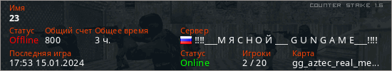 Играет на Counter Strike 1.6 сервере. Страна: РоссияПервый раз замечен 08:36 25.01.2022
