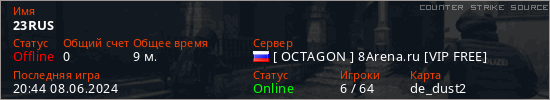 Играет на Counter Strike Source сервере. Страна: РоссияПервый раз замечен 22:43 29.05.2024