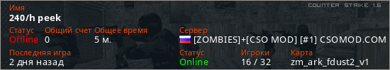 Играет на Counter Strike 1.6 сервере. Страна: РоссияПервый раз замечен 20:10 22.04.2026