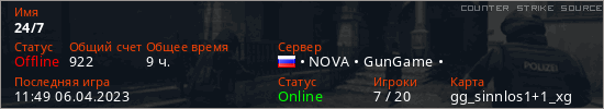 Играет на Counter Strike Source сервере. Страна: РоссияПервый раз замечен 14:52 12.12.2022